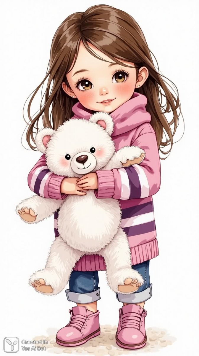 cartoonish depiction of a doll holding a white teddy bear, dressed in a pink sweater with purple and white stripes, featuring long brown hair styled neatly, bg is white.