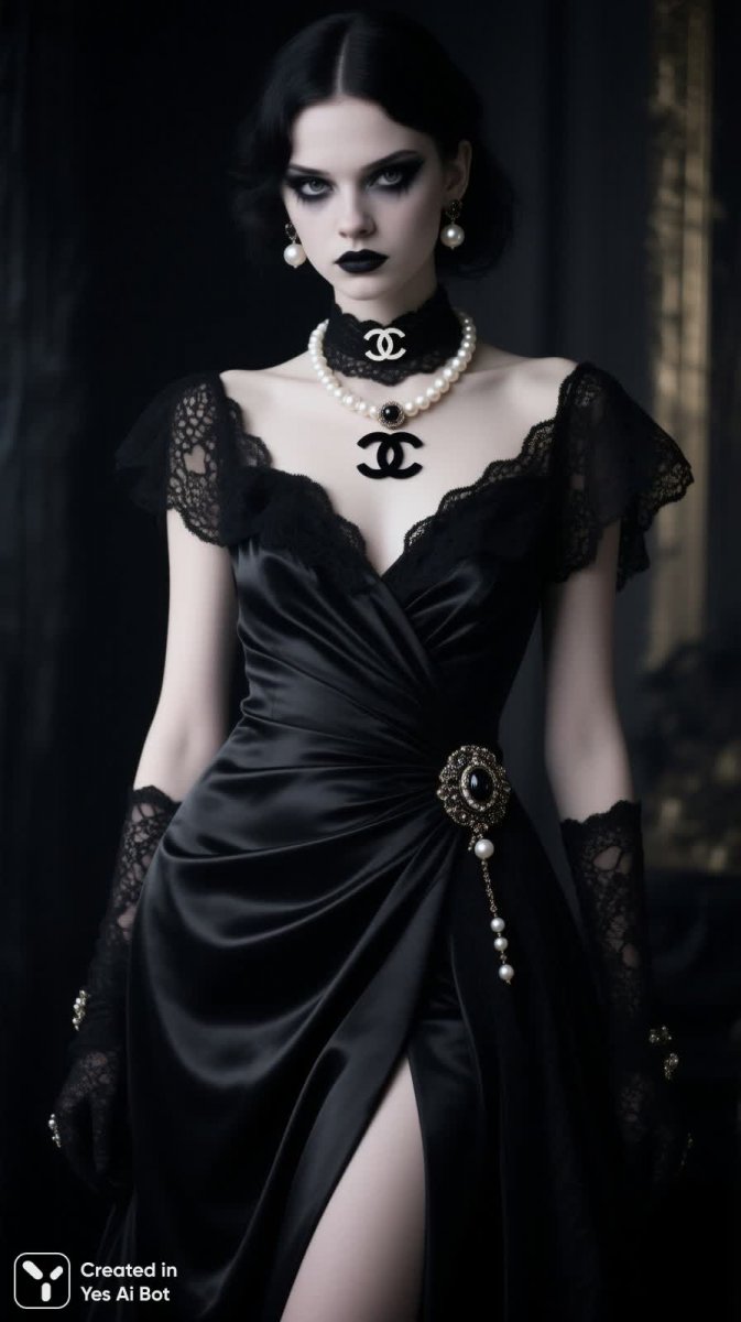 photorealistic, hyper realistic, a captivating goth girl exudes enigmatic charm in a dimly lit alley, fusing the rebellious spirit of John Galliano with the refined beauty of Coco Chanel. Clad in a dramatic, flowing black satin gown with Galliano's signature asymmetrical cuts, she juxtaposes it with Chanel's classic pearl accessories that add a touch of elegance. Layers of dark lace and vintage brooches embellish her attire, while her smoky eye makeup and fierce expression create an atmosphere of dark glamour and intrigue, reflecting a powerful yet luxurious essence.