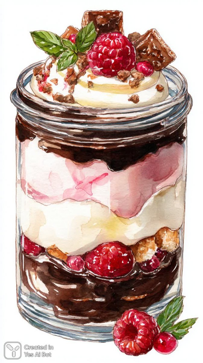 watercolor painting of layered dessert in glass jar, alternating layers of chocolate mousse and whipped cream, topped with crushed cookies and raspberries, mint leaves peeking out, soft pastel colors blending together, perfect for a sweet treat moment, whimsical and delightful style.