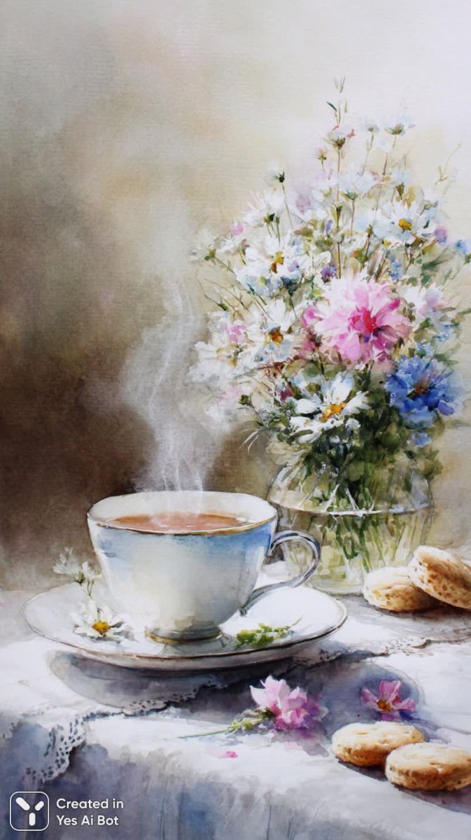 watercolor painting of delightful tea time setup on table, elegant teacup and saucer filled with steaming tea, surrounded by assorted biscuits and scones, fresh flowers in small vase nearby, soft natural light illuminating the scene, inviting and serene ambiance for relaxation.