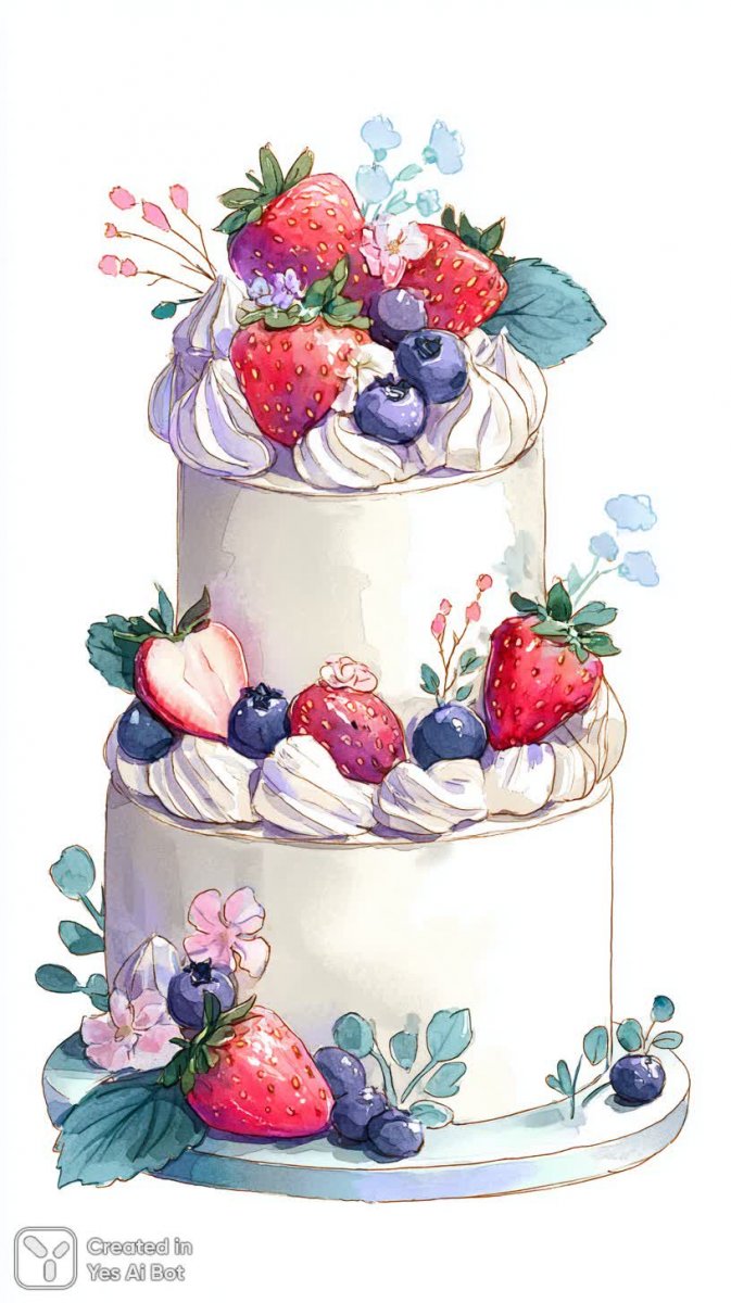 Изысканный акварельный этюд представляет собой многоярусный торт, украшенный свежими ягодами и фруктами. На вершине аппетитно выложены сочные клубники, а между слоями десерта хаотично разбросаны спелые голубики, создавая яркий контраст текстур и цветов. Пастельная цветовая гамма придает изображению нежность и воздушность, подчеркивая легкость и невесомость крема. Взбитые сливки добавляют ощущение пушистости и мягкости, а декоративные элементы в виде красочных листьев придают торту неповторимый шарм и игривость. Композиция пронизана атмосферой праздника и радости, вызывая желание немедленно отведать это восхитительное лакомство. Иллюстрация выполнена с любовью к деталям, демонстрируя мастерство художника в передаче текстуры фруктов, легкости крема и изящества украшений. Это настоящее произведение искусства, которое способно подарить хорошее настроение и вдохновить на создание кулинарных шедевров. Яркие цвета и аппетитный вид торта делают его идеальным украшением для любого мероприятия или просто приятным сюрпризом для любителей сладкого