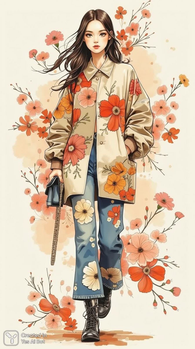 Illustration, ink drawing, fashion girl, uniting the luxurious textures of Chanel with the avant-garde style of Comme des Garçons, characterized by oversized silhouettes and unexpected asymmetry, adorned with intricate floral watercolor details and a touch of sketching, illustrating a harmonious balance between classic elegance and innovative edge.