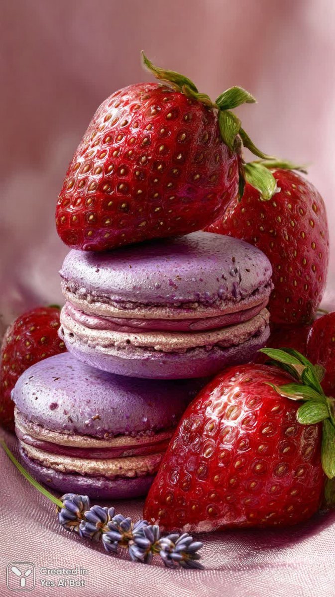 Изысканное великолепие десертов запечатлено в невероятно реалистичном кадре. Перед зрителем предстает макросъемка нежных фиолетовых макаронс и сочных спелых клубник, элегантно расположенных на фоне пастельно-розового цвета. Мягкий рассеянный свет подчеркивает каждую деталь – от бархатистой текстуры макаронс до аппетитной глянцевой поверхности ягод. Яркие насыщенные цвета создают ощущение свежести и сладости, вызывая желание прикоснуться к этой визуальной симфонии вкуса. Изображение поражает своей фотореалистичностью, стирая грань между фотографией и живописью. Это не просто изображение десерта – это произведение искусства, которое пробуждает чувства и вдохновляет на создание собственных кулинарных шедевров. Внимание к деталям настолько велико, что можно различить мельчайшие поры поверхности макаронс и крошечные ворсинки на клубничных ягодах. Эта работа представляет собой вершину мастерства в области гиперреалистичной съемки, демонстрируя невероятную точность и художественный вкус автора. Кажется, будто десерт вот-вот оживет, наполняя воздух восхитительным ароматом ванили и ягодной сладостью. Композиция продумана до мелочей – гармоничное сочетание цветов и текстур создает ощущение умиротворения и эстетического наслаждения. Это идеальный выбор для тех, кто ценит красоту в деталях и восхищается искусством кулинарии