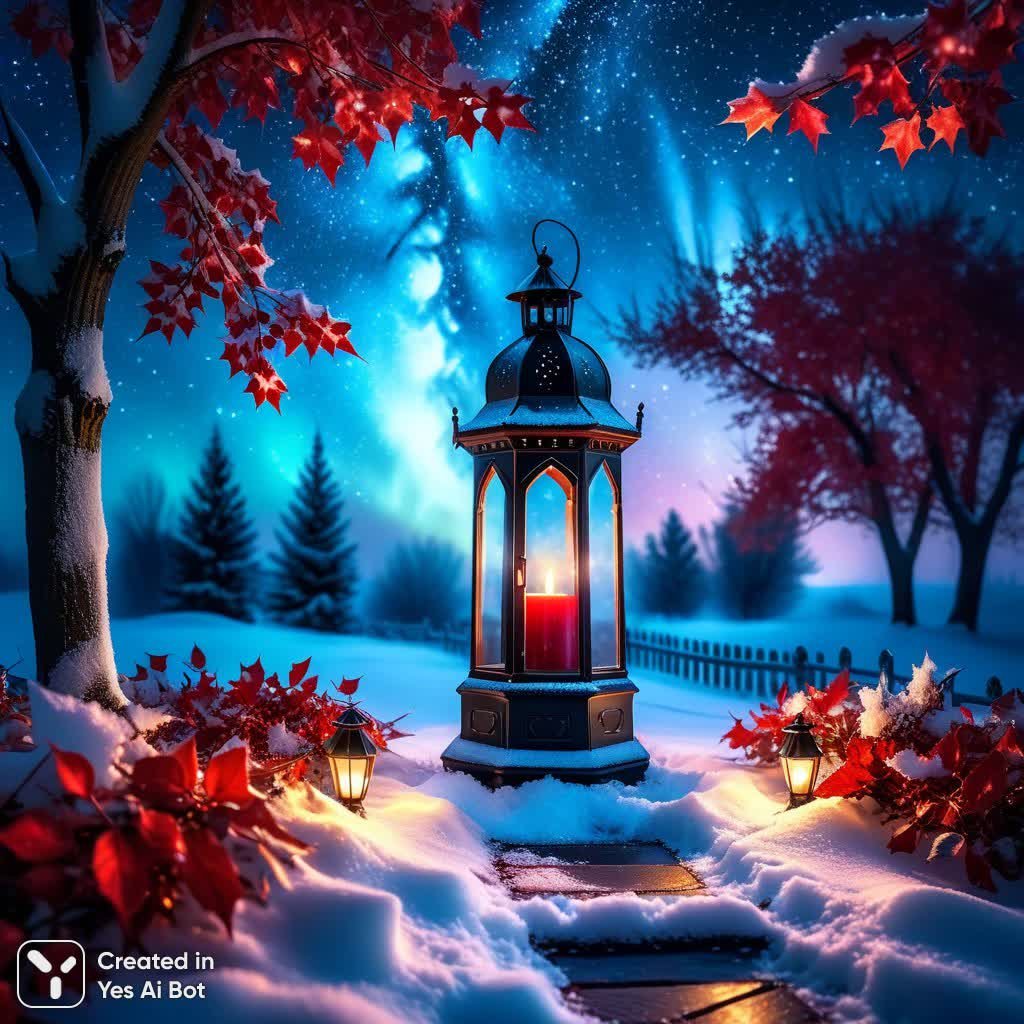 breathtaking winter night, vertical composition, a solitary gothic lantern lighting up a snowy path, surrounded by a wreath of frosted crimson autumn leaves, background is a majestic starry night sky with the milky way and aurora borealis, cold blue ambient light vs warm candle flame, sparkling snow crystals, magical realism, serene and quiet, high contrast, hyperrealistic, 8k