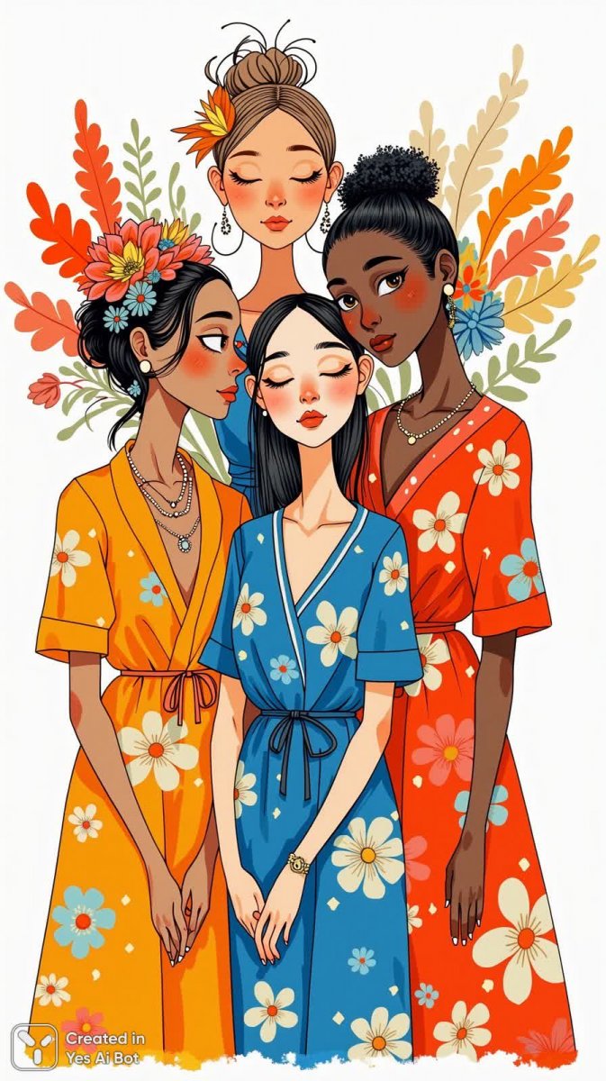 Яркая и жизнерадостная иллюстрация в технике Zentangle изображает четырех женщин, одетых в красочные наряды. Каждая из них вовлечена в непосредственное взаимодействие со зрителем, словно приглашая к участию в беззаботной беседе или увлекательном занятии. Черты лиц намеренно преувеличены, создавая ощущение игривости и подчеркивая индивидуальность каждой героини. Обилие крупных цветочных мотивов добавляет композиции легкости и воздушности, наполняя ее свежестью и романтическим настроением. Фон выполнен в белоснежном цвете и лаконично дополнен простыми геометрическими формами, которые не отвлекают внимание от основных персонажей и акцентируют их выразительность. Взгляд каждой женщины направлен прямо на зрителя, устанавливая тесный эмоциональный контакт и создавая впечатление живого присутствия. Это завораживающее сочетание ярких цветов, детализированных узоров и непосредственного взаимодействия делает иллюстрацию по-настоящему запоминающейся и привлекающей внимание. Картина излучает позитив, энергию и вдохновляет на творчество. Она словно рассказывает историю о дружбе, красоте и радости жизни, передавая зрителям тепло и хорошее настроение. Использование техники Zentangle придает работе особую глубину и текстурность, а акцент на деталях делает ее поистине уникальной