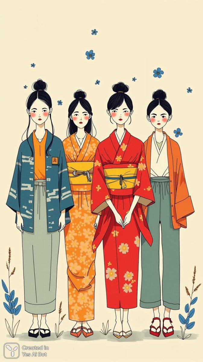 Четыре молодые женщины в ярких нарядах оживают на светлом бежевом фоне, усыпанном нежными голубыми цветами. Это минималистичный рисунок тушью, выполненный с акцентом на преувеличенные черты и простые формы. Одна из девушек эффектно выделяется в алом кимоно, добавляя композиции нотку экзотики и элегантности. Каждая фигура тщательно проработана, передавая индивидуальность каждой героини. Взгляд женщин направлен прямо на зрителя, создавая ощущение вовлеченности и непосредственного контакта. Использование ограниченной цветовой палитры подчеркивает чистоту линий и лаконичность стиля. Это произведение искусства – пример изящного сочетания простоты и выразительности, где каждый элемент несет свою смысловую нагрузку, а минимализм служит инструментом для усиления эмоционального воздействия. Рисунок излучает спокойствие и умиротворение, приглашая зрителя остановиться и насладиться красотой каждого момента. Превосходный пример современного искусства, сочетающего в себе традиции восточной эстетики и западного минимализма, создавая уникальный визуальный опыт. Это не просто изображение – это история, рассказанная языком линий и цвета