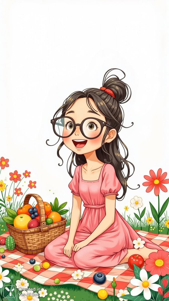 Милая иллюстрация в мультяшном стиле изображает очаровательную маленькую девочку с огромными очками, уютно расположившуюся на пледе для пикника. В ее руках – корзинка, полная свежих фруктов, а сама она одета в розовое платье и заливисто смеется, излучая беззаботность и радость. Вокруг нее раскинулась живописная сцена пикника, украшенная множеством ярких цветов, создающих атмосферу летнего праздника и тепла. Фон выполнен в белом цвете, что позволяет акцентировать внимание на деталях изображения и подчеркивает легкость и воздушность композиции. Эта картина – воплощение детской непосредственности, веселья и безмятежности, способная вызвать самые теплые чувства и воспоминания о летних днях, проведенных на природе. Детализированный рисунок передает каждую мелочь: от складок платья до искренней улыбки девочки, что делает его особенно привлекательным для любителей мультяшного искусства и детской тематики. Идеально подойдет для оформления детских комнат, создания открыток или использования в качестве иллюстрации к сказкам и историям о дружбе и веселье. Это настоящее произведение искусства, наполненное позитивом и добром