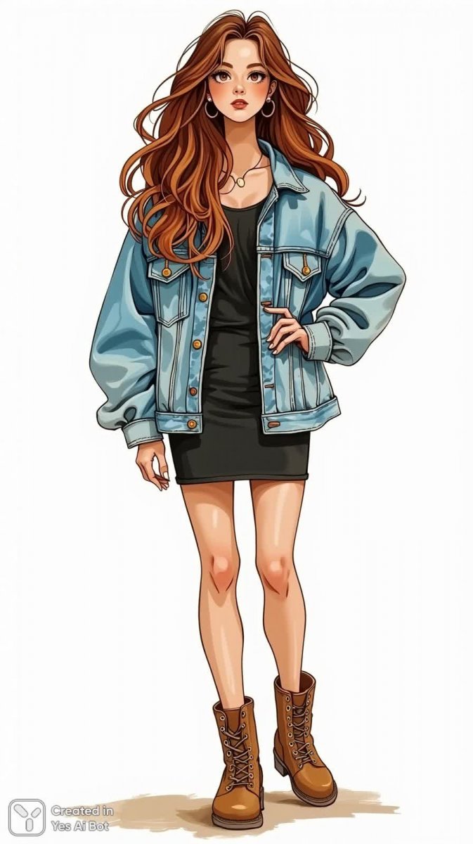 Яркая и жизнерадостная иллюстрация в стиле наивного искусства сочетает в себе элементы doodle-рисунка и техники зентангл, создавая ощущение легкости и непосредственности. В основе лежит техника бумажного вырезания с добавлением гуаши, что придает работе особую текстуру и глубину. На простом белом фоне изображена молодая женщина, излучающая уверенность и стиль. Ее образ представляет собой интересное сочетание: объемная джинсовая куртка oversize контрастирует с облегающим черным платьем, а элегантные ботильоны завершают ансамбль. Длинные кудрявые волосы ниспадают на плечи, подчеркивая динамичность и энергию героини. Взгляд девушки направлен прямо в камеру, выражая открытость и позитивный настрой. Общая композиция напоминает забавный мультяшный рисунок с элементами народного творчества, создавая ощущение тепла и уюта. Эта иллюстрация — идеальное сочетание простоты и оригинальности, способное украсить любое пространство и подарить хорошее настроение. Она передает атмосферу непринужденности и индивидуальности, подчеркивая красоту в деталях и гармонию стиля