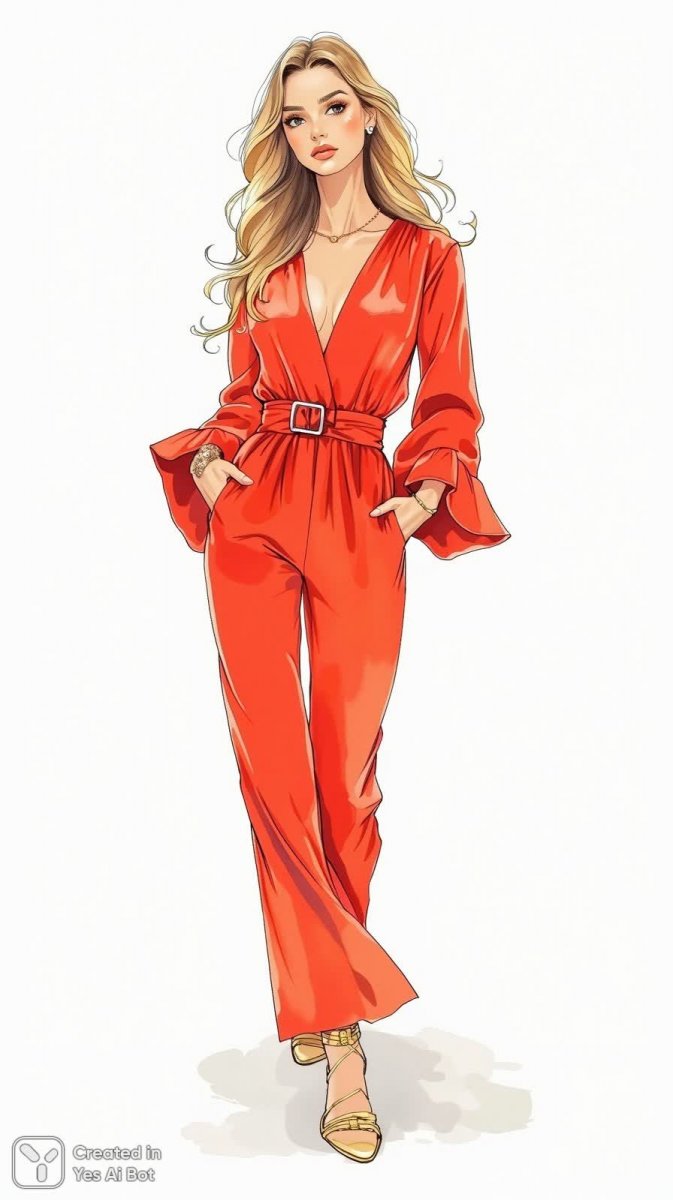 Изящная мода в акварели: завораживающая иллюстрация женщины в ярком алом комбинезоне, подчеркивающем ее фигуру. Глубокий V-образный вырез и широкие манжеты добавляют образу элегантности и изысканности, а тонкий пояс в тон создает идеальный силуэт. Золотые босоножки на ремешках завершают образ, придавая ему нотку роскоши и гламура. Длинные волосы, уложенные мягкими волнами, обрамляют лицо модели, создавая ощущение легкости и женственности. На фоне простого белого полотна акварельные краски оживают, передавая текстуру ткани и игру света на деталях комбинезона. Эта иллюстрация – воплощение современной моды и безупречного стиля, сочетающее в себе яркость цвета, изящные линии и нежность акварельной техники. Она словно приглашает зрителя окунуться в мир высокой моды и почувствовать атмосферу творчества и вдохновения. Каждая деталь продумана до мелочей, от блеска золотых туфель до мягких переливов света на волосах модели, создавая неповторимый образ, который захватывает дух своей красотой и гармонией. Этот акварельный шедевр станет прекрасным украшением для любого интерьера или вдохновением для будущих модных тенденций. Он излучает уверенность, стиль и изысканность, отражая современный взгляд на женскую красоту