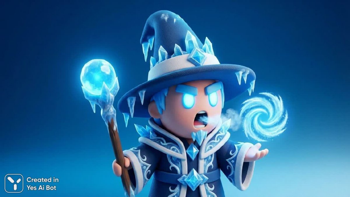 Создать ледяную провидицу в стиле волшебника. Сохранить его пропорции и художественные принципы. Добавить ледяные узоры, прозрачные ткани и голубое свечение глаз. Фон — синий градиент.