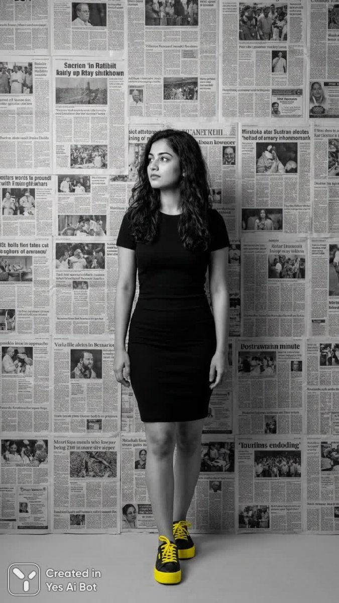 monochrome, bw digital art, bright yellow accent on sneakers, minimalistic young woman standing in front of large newspaper wall, wearing black fitted dress, short hair styled in waves, looking thoughtfully to the side, BG is a collage of newspaper clippings.