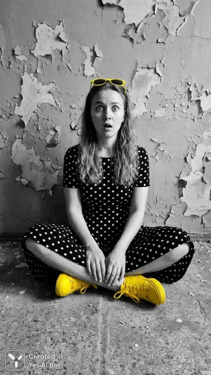 Завораживающая монохромная картина в цифровом формате оживает ярким акцентом – сочными желтыми кроссовками, выделяющимися на фоне серого пространства. Молодая женщина в лаконичном черном платье с белыми горошинами, сидящая на бетонном полу, застыла в выражении удивления. Этот момент запечатлен с минималистичной эстетикой, подчеркивающей простоту композиции и игру света и тени. Яркие желтые солнцезащитные очки, небрежно водруженные на голову, добавляют образу игривости и динамизма. Задний план, состоящий из облупившейся краски на стенах, придает снимку ощущение урбанистической атмосферы и легкой меланхолии. Контраст между черно-белой гаммой и вспышкой желтого цвета создает визуальный интерес и привлекает взгляд зрителя к деталям, раскрывая историю одного мгновения – внезапного удивления, запечатленного в современном цифровом искусстве. Картина передаёт ощущение спокойствия и созерцательности, приглашая задуматься о красоте простоты и неожиданных акцентах в повседневной жизни. Это не просто изображение, это визуальная поэзия, где каждый элемент играет свою роль, создавая гармоничную и запоминающуюся композицию