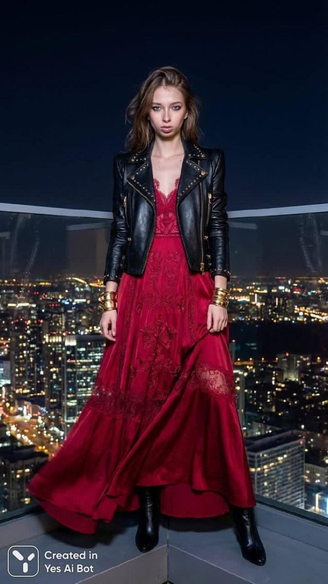 photorealistic, hyper realistic, a sophisticated fashionista woman stands confidently on a rooftop, overlooking a stunning skyline. Emulating the luxe vibe of Valentino, she wears a flowing crimson silk gown with intricate lace detailing, seamlessly fused with an edgy leather jacket reminiscent of Balmain’s rock-chic style. Paired with sleek ankle boots and statement gold bangles, her fierce gaze and elegant posture project an air of empowerment, creating a striking contrast between softness and strength that captivates the viewer.