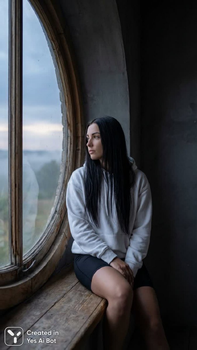 Задумчивый взгляд сквозь круглое окно передает атмосферу таинственности и легкой грусти. Молодая женщина с серьезным выражением лица, одетая в белую толстовку и черные шорты, кажется отрешенной от окружающего мира. Ее длинные гладкие волосы обрамляют лицо, создавая мягкий контраст на фоне темно-серого пространства за окном. Кажется, она погружена в свои мысли, устремив взгляд вдаль, туда где скрываются неясные перспективы и возможно, размышления о чем-то важном. В ее позе чувствуется внутренняя сила и спокойствие, несмотря на кажущуюся меланхолию. Одиночество и созерцание слились в единый образ, который заставляет задуматься о скрытых глубинах человеческой души и невысказанных чувствах. Фотография передает ощущение мимолетности момента, словно мы случайно стали свидетелями личного переживания этой девушки, ее внутренней драмы или просто тихого размышления. Свет, проникающий сквозь круглое стекло, мягко освещает ее лицо и подчеркивает красоту и хрупкость момента. Эта сцена – это не просто портрет, а скорее окно в мир мыслей и эмоций человека, запечатленного в тишине и одиночестве перед лицом неизведанного