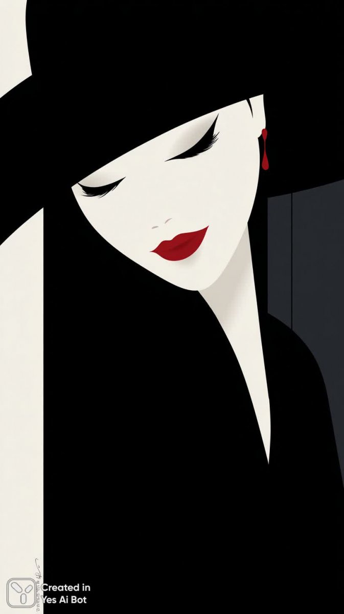 Изящный женский портрет в духе минимализма и примитивизма завораживает своей простотой и выразительностью. Лицо с закрытыми глазами, выполненное в виде простых геометрических форм, излучает спокойствие и умиротворение. Акцент на губах выделен яркой помадой насыщенного красного оттенка, создавая эффектный контраст на фоне лаконичного дизайна. На голове модели – большая черная шляпа с широкими полями, добавляющая образу загадочности и элегантности. Фон представляет собой черно-белые вертикальные линии, усиливающие ощущение графичности и подчеркивающие минималистичный стиль изображения. Композиция выдержана в духе модерна, где ключевую роль играет игра света и тени, а также использование ограниченной цветовой палитры для достижения максимального визуального воздействия. Этот портрет – ода красоте простоты, сочетающая в себе классические элементы и современные тенденции в искусстве. Он словно приглашает зрителя задуматься о сущности красоты и гармонии, скрытых в самых простых формах. Изображение вызывает ощущение утонченности, спокойствия и внутренней силы