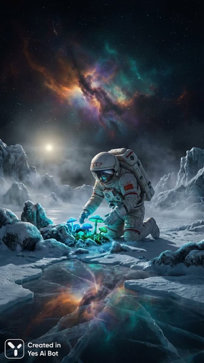 Европа: грибы и космос в ледяной бездне советского фотографа - Генерация изображения с помощью нейросети Nano Banana