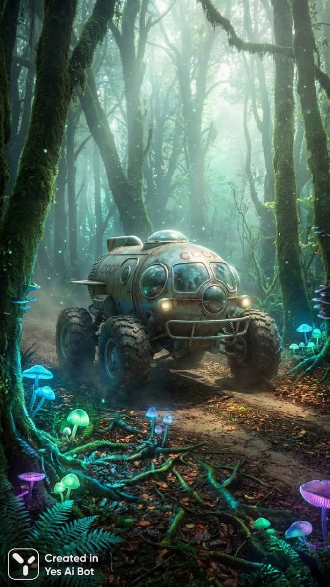 Загадочный космокар в волшебном лесу эпохи СССР - Пример изображения, созданного ИИ Nano Banana