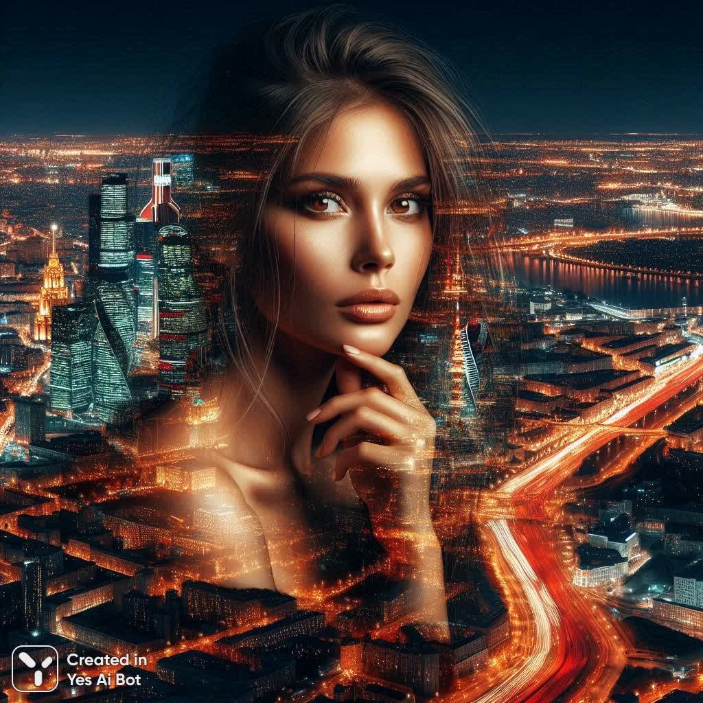 Портрет женщины, профессионально и красиво интегрированный в двойную экспозицию с ночным неоновым видом Москвы, снятым с 100-го этажа восточной башни Федерации в Москва-Сити. Основное внимание уделите тому, чтобы образ женщины состоял из пейзажа ночной Москвы, создавая гармоничное сочетание портрета и городского фона. Высокая детализация, акцент на плавные переходы между портретом и пейзажем. Используйте светлые холодные тона и яркое освещение для создания атмосферного эффекта, подчеркивающего магию ночного города.