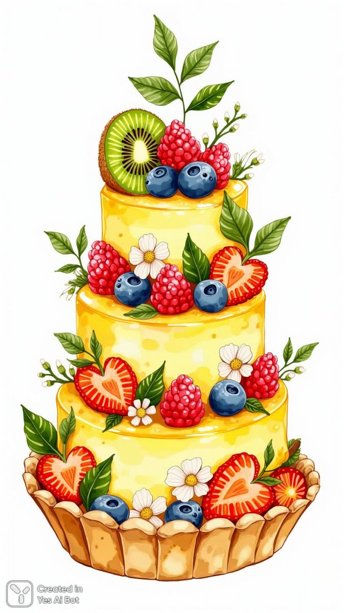 colorful illustration of a layered fruit tart, golden crust filled with yellow custard, topped with a variety of fresh fruits including raspberries, blueberries, and slices of kiwi, decorated with green leaves and small edible flowers, whimsical and playful style, ink drawing, naive art, doodling, zentagle, folk art, cartoonish, paper cut gouache illustration, BG is white.