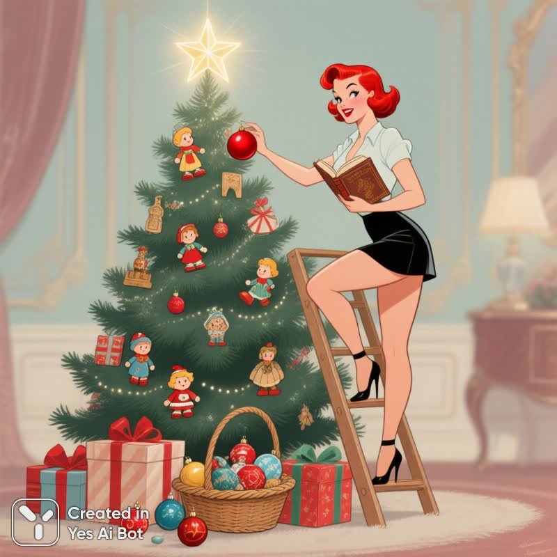Очаровательная рыжеволосая красавица в стиле пин-ап с короткой стрижкой создает волшебную атмосферу новогоднего праздника, украшая старинную елку игрушками начала двадцатого века. На вершине дерева сияет звезда Вифлеема, а под елкой и рядом с ней – роскошно упакованные подарки, готовые порадовать близких. В корзине у основания дерева аккуратно сложены новогодние украшения, добавляющие праздничного настроения. Девушка грациозно стоит на стремянке в традиционной позе пин-ап, одной рукой держа старинную книгу, а другой – ярко-красный шар, символизирующий радость и волшебство. Размытый фон представляет собой классический роскошный интерьер, подчеркивающий атмосферу уюта и благополучия. Эта картина переносит нас в эпоху элегантности и изысканности, где традиции рождественского чуда сочетаются с неповторимым шармом ретро-стиля. Изображение излучает тепло, радость и предвкушение праздника, создавая ощущение сказки и волшебства, которое свойственно только Новому году. Каждая деталь, от старинных игрушек до классического интерьера, продумана с любовью к деталям, что делает эту картину поистине уникальной и запоминающейся. Это идеальное сочетание винтажного стиля и рождественского настроения, которое обязательно подарит хорошее настроение и ощущение праздника каждому зрителю