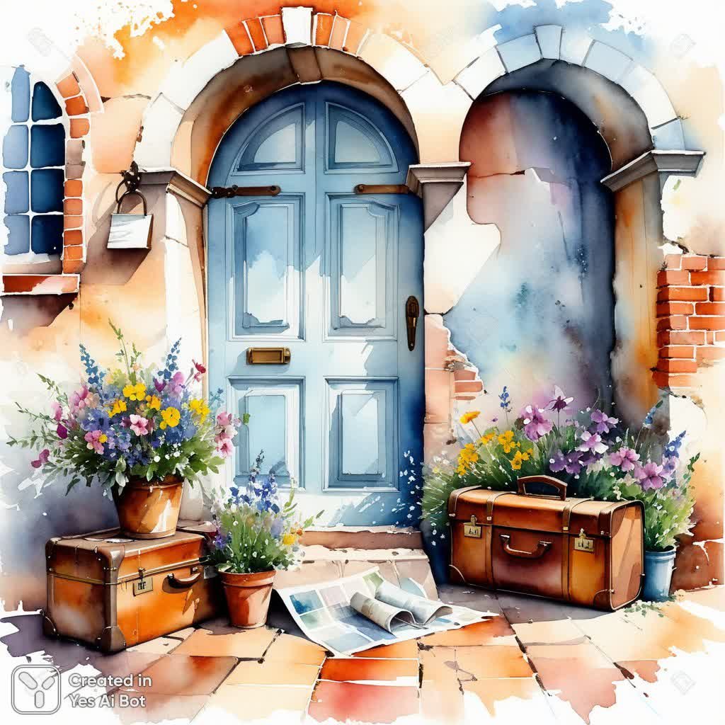 Белый фон, прозрачная акварель, цветные чернила, сфумато, вечер, арочная дверь, рядом с дверью, чемодан, на чемодане мятая газета, лейка с букетом полевых цветов, фрагмент стены, трещины, кирпич, прорисовка деталей, гранж, атмосферно