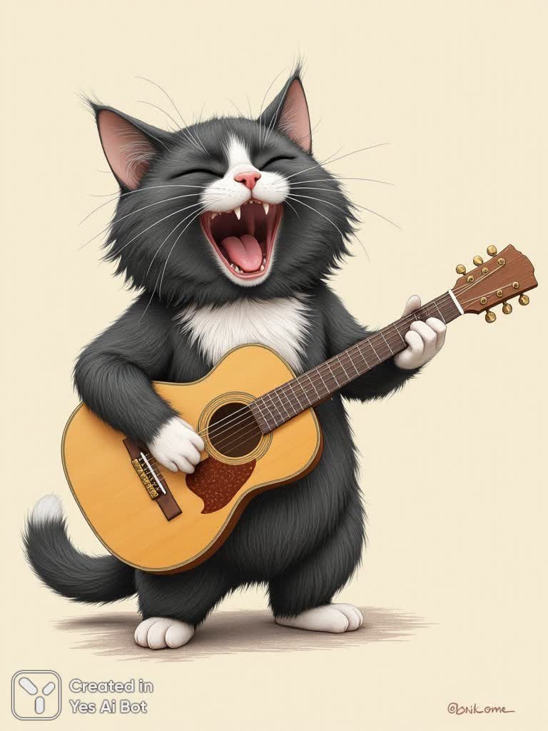 Забавный персонаж – антропоморфный кот, полный энергии и радости, увлеченно играющий на гитаре. Иллюстрация выполнена в стиле классических мультфильмов с использованием техники, напоминающей ручную работу и карандашные рисунки. Пушистый котик, выполненный в угольно-черных тонах с белым пятном вокруг шеи и мордочки, покоряет своей непосредственностью и обаянием. Его немного увеличенная голова придает изображению комичности, а длинные элегантные усы подчеркивают его забавную внешность. Широко раскрытый рот в искреннем хохоте, прищуренные глаза, полные веселья – все это создает атмосферу беззаботности и счастья. Гитара, выполненная в теплых золотисто-желтых тонах с коричневым звуковым отверстием и грифом, уверенно покоится в лапах у кота. Простой фон бежевого цвета позволяет полностью сосредоточиться на главном герое и его музыкальном настроении. Мягкое равномерное освещение создает ощущение тепла и уюта, усиливая общее впечатление от этой милой и трогательной иллюстрации. Картина излучает позитив и приглашает зрителя разделить радость этого веселого кота-музыканта, погружаясь в мир безграничного воображения и детской непосредственности