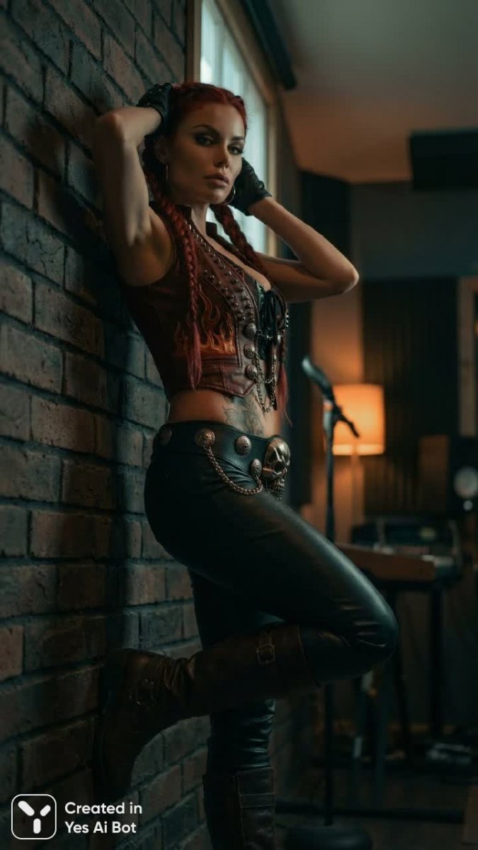 Изображение демонстрирует женский образ, созданный нейросетью Nano-Banana. В центре внимания – загадочная и уверенная женщина, позирующая в сапогах возле стены. Она смотрит прямо в камеру, а ракурс снизу вверх подчеркивает изящные линии фигуры и добавляет образу монументальности. Руки небрежно заброшены в волосы, придавая снимку естественности и чувственности, а согнутая нога в колене создает динамичный акцент.