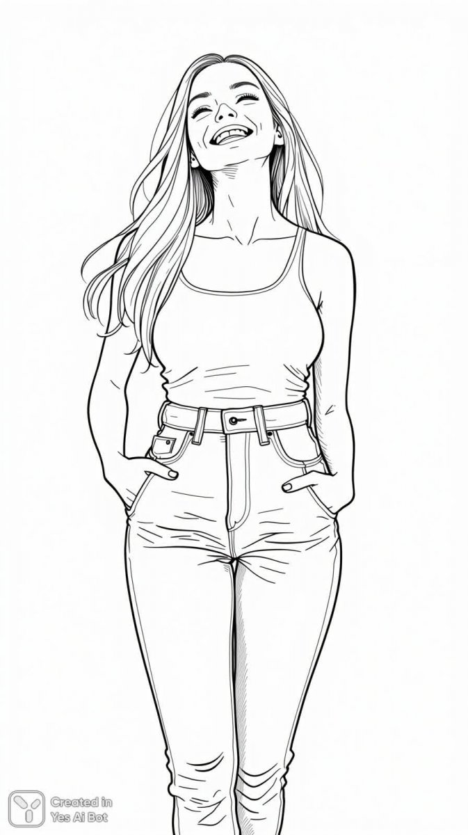 black and white line drawing of young woman with long straight hair, wearing tank top and high-waisted jeans, playful smile on her face, hands in pockets, looking up as if enjoying a moment of joy, simple and clean lines, line art, minimalism.