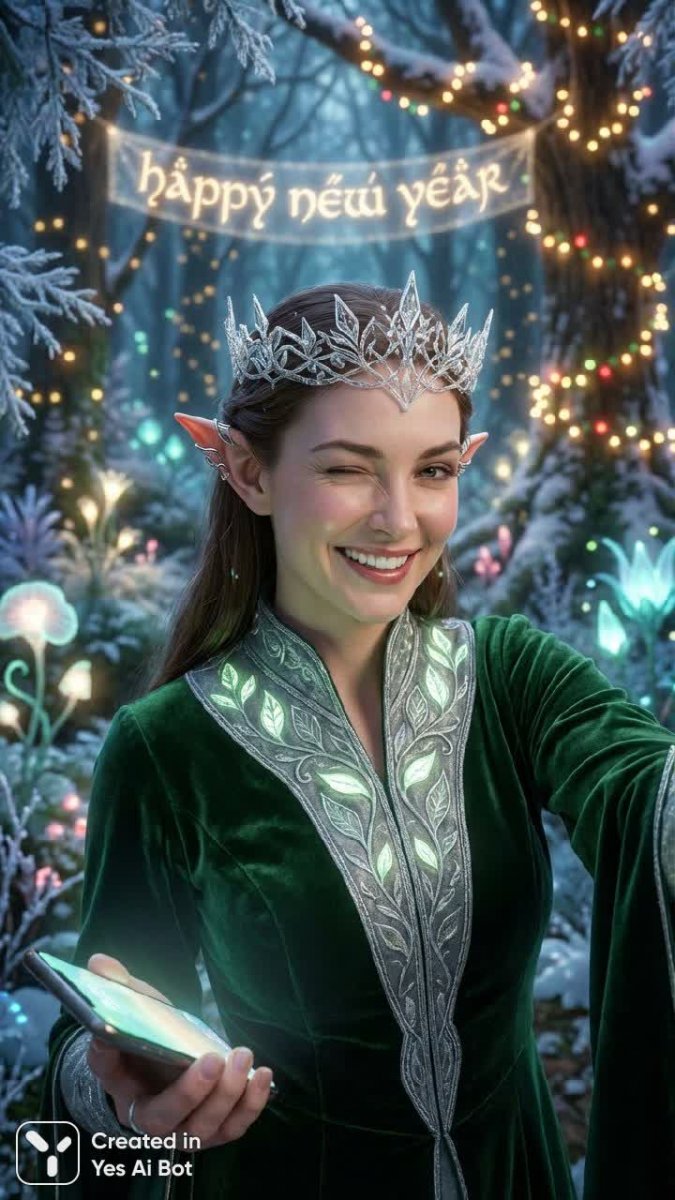 Эльфийское новогоднее селфи в волшебном лесу - Пример работы нейросети Nano-Banana
