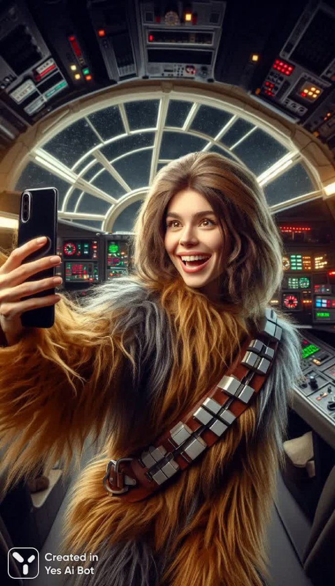 Забавный снимок демонстрирует женщину, перевоплотившуюся в Чубакку из вселенной 'Звездных войн'. На ней коричневый меховой костюм, напоминающий шкуру йети, а через грудь перекинут широкий бандаж. В руках она держит телефон, широко улыбаясь и делая селфи с довольным выражением лица. За ее спиной видна узнаваемая кабина корабля 'Тысячелетний сокол', что добавляет сцене атмосферы приключения и космических путешествий. Фотография пронизана духом праздника и веселья, явно посвященного Новому году или какому-либо другому радостному событию. Ощущается атмосфера беззаботности и позитива, как будто героиня наслаждается моментом, запечатлевая его для потомков. Это яркий пример того, как можно креативно использовать косплей и современные технологии, чтобы создать запоминающееся фото в праздничной обстановке. Изображение излучает энергию радости и оптимизма, передавая ощущение волшебства новогодних каникул или просто хорошего настроения. Оно способно вызвать улыбку у зрителя и вдохновить на собственные творческие эксперименты, показывая, что даже в самых необычных образах можно найти повод для селфи и празднования. Это забавный и оригинальный взгляд на сочетание фантастических миров и современных технологий, создающий неповторимую атмосферу праздника и приключений