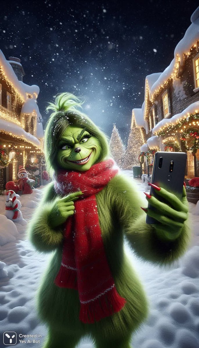 Задорная нимфа Гринча делает селфи в преддверии новогодних чудес. Пушистое изумрудное пальто и алая шаль подчеркивают ее игривый образ, а хитрый озорной ухмылкой на лице выдает нетерпение перед праздничными событиями. На снимке запечатлен сказочный зимний пейзаж: уютная деревня утопает в снегу, мерцая разноцветными огнями. Вся композиция пропитана атмосферой беззаботности и веселья, создавая ощущение волшебства и предвкушения долгожданного Нового года. Это яркое изображение воплощает дух праздника – энергичный, забавный и полный позитива, словно приглашение к радостным моментам и незабываемым приключениям в кругу близких людей. В кадре заключена настоящая магия зимнего волшебства, которая согревает сердце теплом и дарит веру в чудеса. Изображение излучает оптимизм и хорошее настроение, заряжая зрителя праздничной энергией и желанием разделить радость с окружающими