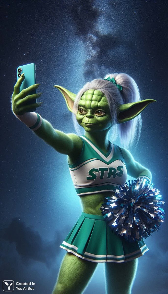 Веселый Йода-руководительница группы поддержки делает селфи на фоне звездного неба. Мастер джедай в неожиданной роли: зеленая кожа, фирменный хвостик и яркий спортивный костюм для чирлидера создают неповторимый образ. В руках у него телефон, а на лице – воодушевленное выражение лица, полное энергии и позитива. Эта забавная фотография пронизана праздничным настроением и идеально подходит для встречи Нового года. Изображение излучает безграничное веселье и спортивный дух, передавая атмосферу радости и праздника. Представьте себе, как Йода поддерживает команду с энтузиазмом и оптимизмом, заряжая всех вокруг своей неповторимой энергией. Эта фотография – воплощение хорошего настроения и позитива, идеальное дополнение к новогодним поздравлениям или просто способ поднять настроение в любой день. Яркие цвета и динамичная поза Йоды делают его образ запоминающимся и привлекательным для широкой аудитории. Забудьте о привычном облике мудрого джедая – перед вами Йода-чирлидер, готовый к празднику и новым свершениям! Эта фотография - заряд бодрости и хорошего настроения на весь год