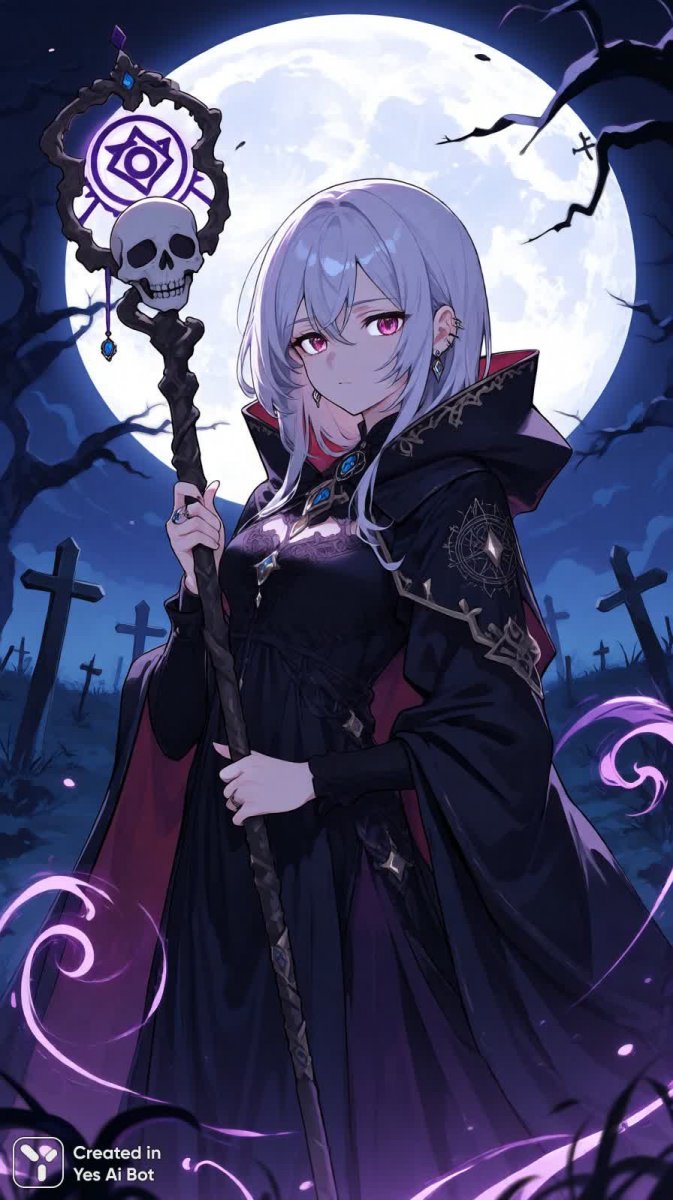 Завораживающая иллюстрация в стиле аниме представляет собой изысканную некроманта, облаченную в темные рясы, которая излучает таинственную притягательность. Ее пронзительный взгляд привлекает внимание, словно гипнотизируя зрителя. В ее руках покоится черепообразный посох, украшенный древними аркаными символами, а вокруг нее клубится мерцающая тьма, создавая атмосферу загадочности и мистики. Действие разворачивается на фоне жуткого кладбища, озаренного лунным светом полной луны, что придает сцене дополнительную зловещую красоту. Это произведение искусства пленяет своей детальностью и мастерством исполнения, передавая ощущение потустороннего мира и незримой силы. Изображение наполнено мрачной элегантностью, сочетающей в себе элементы фэнтези и готики, создавая неповторимый визуальный опыт для зрителя. Это портрет могущественной личности, овладевшей темными искусствами, чье присутствие вызывает одновременно восхищение и страх. Каждая деталь тщательно продумана, от сложной вышивки на рясах до едва заметных теней, танцующих по кладбищенской земле. Это не просто иллюстрация – это окно в мир магии и тьмы, где реальность переплетается с кошмарами, а красота сосуществует со злом