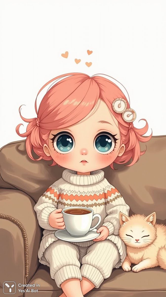 Уютная сцена с куклой в нежно-розовых волосах и огромных голубых глазах, погруженной в атмосферу домашнего тепла. Кукла удобно расположилась на коричневом диване, держа в руках чашку ароматного чая, словно наслаждаясь спокойным моментом. На ней – мягкий и комфортный свитер с полосками, который добавляет образу очарования и уюта. Рядом, клубочком свернувшись, сладко спит пушистый котик, создавая ощущение безмятежности и гармонии. Белый фон подчеркивает чистоту и нежность всей композиции, делая акцент на деталях и мягких тонах. Картина излучает тепло, спокойствие и располагает к уюту, словно приглашая зрителя разделить этот момент тишины и комфорта с милой куклой и её верным котом. Это идеальный образ для любителей милых вещей и нежных цветов, создающий атмосферу тепла и домашнего очарования. Иллюстрация прекрасно подойдет для оформления детских комнат или создания уютного настроения в любом интерьере, наполняя пространство позитивными эмоциями и приятными воспоминаниями