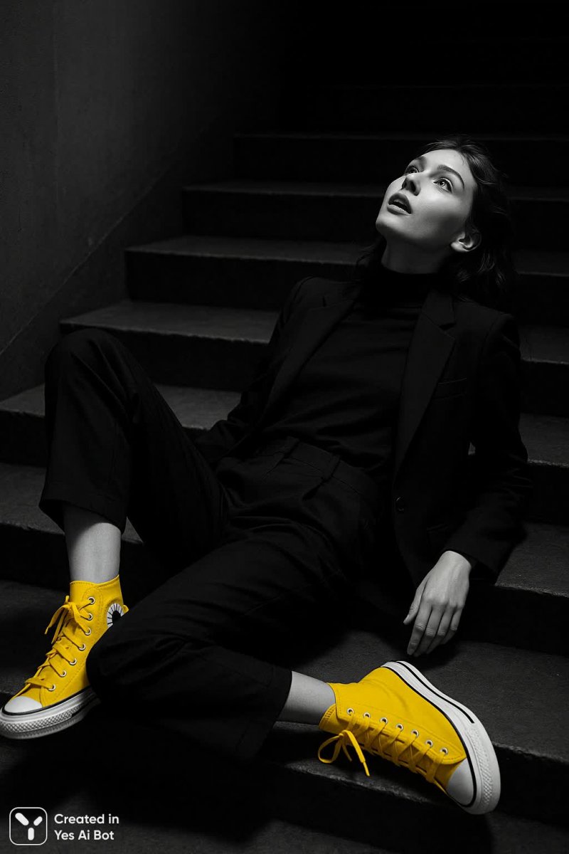 Завораживающий монохромный снимок, где черно-белая палитра идеально подчеркивает яркий акцент – сочные желтые кроссовки. Молодая женщина, укутанная в полосатый свитер и черные леггинсы, нежно расположилась на лестнице, создавая ощущение покоя и безмятежности. Ее голова запрокинута назад, а выражение лица исполнено восхищения и легкой задумчивости – словно она созерцает что-то прекрасное, скрытое в полумраке. Игра света и тени добавляет композиции глубины и драматизма: приглушенный фон с каскадом теней, ниспадающих по ступеням, создает таинственную атмосферу, фокусируя внимание на центральном объекте – девушке и ее яркой обуви. Минималистичный подход к изображению позволяет зрителю сосредоточиться на деталях и эмоциях, запечатленных в этом моменте. Это не просто фотография – это визуальная поэзия, передающая настроение спокойствия, удивления и легкой ностальгии. Работа выполнена с использованием цифровой техники, что обеспечивает высокую четкость и детализацию изображения, позволяя рассмотреть каждую мелочь: текстуру ткани, игру света на поверхности кроссовок, выражение лица модели. Снимок идеально подходит для тех, кто ценит простоту, элегантность и нестандартный подход к визуальному искусству, воплощая в себе гармонию между черно-белым минимализмом и ярким цветовым акцентом