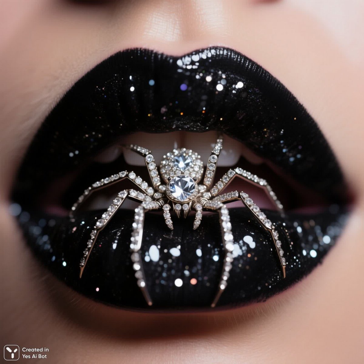 hyper realistic, photorealistic, a close-up of woman's mouth, with lips painted black and covered in shiny glitter, featuring a diamond-studded spider at the center, intricately detailed against a blurred background.