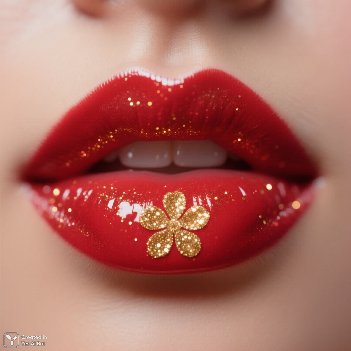 hyper realistic, photorealistic, a close-up of woman's lips painted in bright red, with gold glitter forming a small flower design, creating an elegant appearance, while the background is softly blurred.