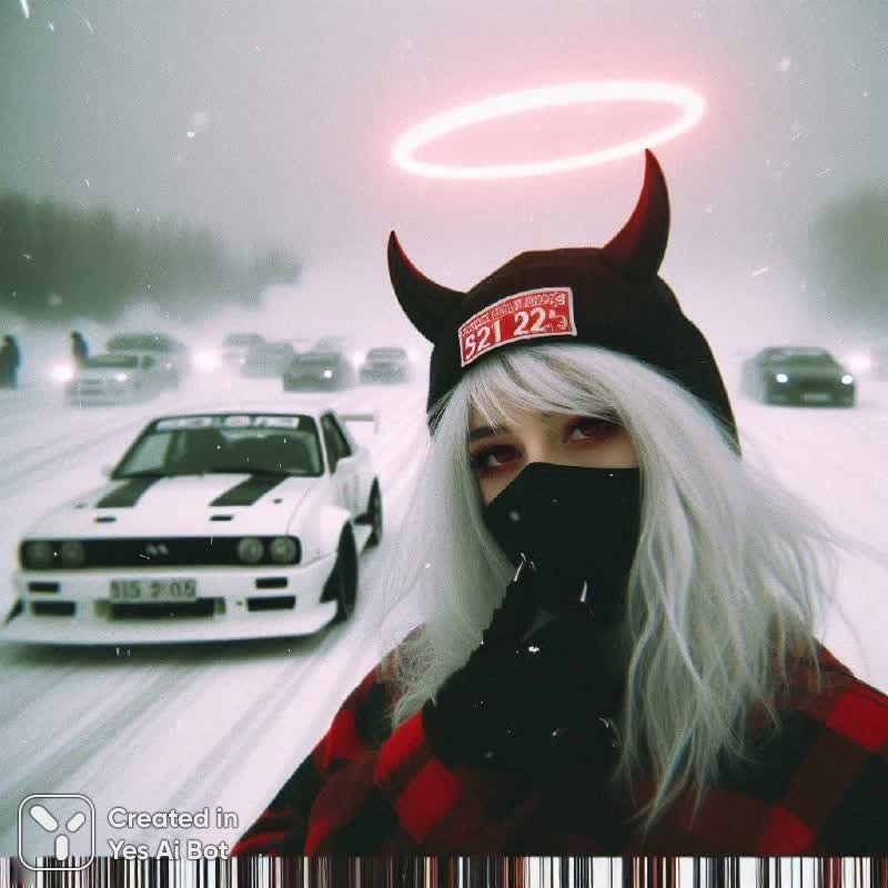 Загадочная красотка в образе ангела-бунтаря запечатлена на аналоговой пленке, словно сошедшей с пожелтевшего фото из прошлого. Белое изображение, пронизанное цифровыми помехами и глитч-эффектом, создает ощущение дежавю и нереальности происходящего. Снежная ночь служит фоном для динамичной сцены: девушка в стильной белой толстовке и массивной серебряной цепи бежит сквозь фон дрифт гонок, ее силуэт подчеркнут ярким акцентом света. На ней – черная балаклава, скрывающая лицо, а голову венчает красная бандана с демоническими рогами, над которыми сияет светящийся нимб ангела, создавая неожиданный контраст между святостью и бунтарством. Растрепанные светлые волосы частично закрывают серо-голубые глаза, полные энергии и загадочности. В руке она держит ветви ели, украшенные мерцающей гирляндой, добавляя образу нотку праздничной непредсказуемости. Стильные белые кроссовки на платформе и потертые брюки завершают хулиганский стиль. Изображение дополняется красным принтом с комиксными надписями и эффектом яркой фотовспышки, усиливающим ощущение движения и моментальной запечатленной реальности. Штрихкод внизу фото намекает на цифровое переосмысление аналогового искусства, создавая сложную игру между прошлым и будущим, реальностью и иллюзией. Это портрет современной иконы – дерзкой, стильной и неповторимой