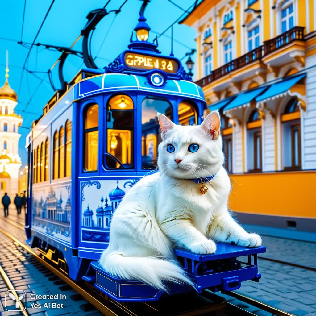 Космический неоновый синий с белым трамвай с росписью под гжель. Трамвай едет по алмазным рельсам. В кабине водителя белый кот в кепке и жилетке с росписью под гжель. Город белые с синим дворцы с золотыми лестницами и золотыми куполами