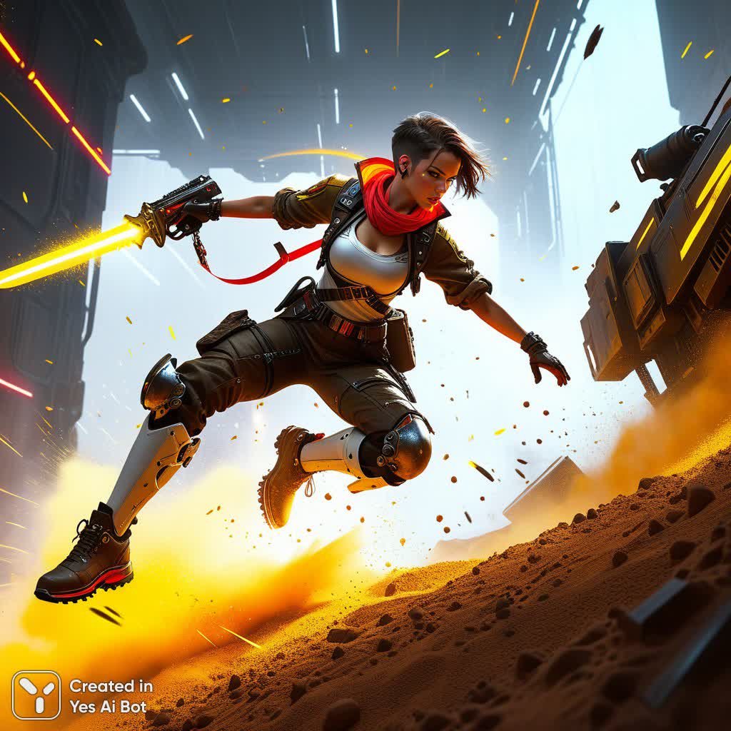 Динамичная сцена из цифровой игры в стиле биомеханики и дизельпанка захватывает дух. Главный герой с короткой стрижкой, облаченный в современную боевую экипировку и держащий футуристическую цепную бензопилу, стремительно скользит вниз по невидимой поверхности. Его фигура освещена завораживающим коричнево-белым свечением, а вокруг бушует вихрь из красно-желтой неоновой пыли, создавая ощущение хаоса и энергии. Впечатляющая композиция дополняется элементами антигравитации и сложной системой Omniframe, что намекает на передовые технологии мира игры. Фон – таинственный белый туман, подчеркивающий динамику сцены и загадочность происходящего. Ракурс съемки с высоты птичьего полета позволяет рассмотреть все детали экшена и ощутить масштаб происходящего. Вся картина пронизана мощью и технологическим совершенством, представляя собой яркий пример современного игрового арта, где сочетаются элементы научной фантастики и постапокалиптического мира. Это визуальный шедевр, который заставляет зрителя погрузиться в мир будущего, полный опасностей и приключений. Ощущение скорости и мощи передается каждой деталью изображения