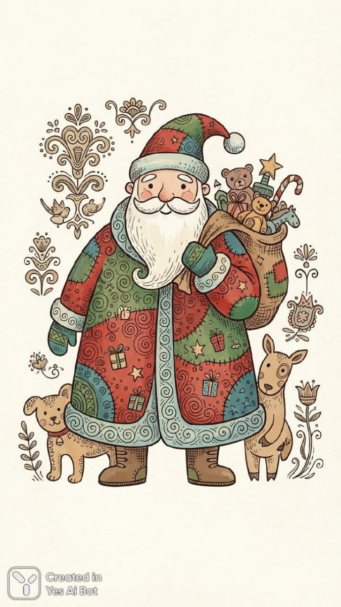 На изображении представлен рисунок в наивном стиле, выполненный чернилами в нежных тонах и напоминающий коллаж. Он изображает участника обмена подарками по системе 'Тайного Санты' в полный рост. В работе сочетаются элементы иллюстрации, забавных каракулей, узоров зентангл и фольклорного декора, создавая игривый и причудливый эффект, напоминающий бумажные аппликации и гуашевые иллюстрации. Белый фон подчеркивает детали рисунка, а пропорция 1:1 обеспечивает сбалансированную композицию. Общее впечатление - легкость, радость и креативность, передающие атмосферу праздника и дружеской тайны. Рисунок отличается мягкими линиями, нежными цветами и беззаботной атмосферой, что делает его привлекательным для широкой аудитории, любящей оригинальное искусство. Он излучает позитив и создает ощущение волшебства, идеально подходя для оформления открыток или иллюстраций к детским книгам. Изображение создано нейросетью NanoBanana v.1.0 Pro по запросу (промту), в котором описывался 'элегантный рисунок чернилами участника Тайного Санты, полный рост, причудливый и игривый стиль'.
