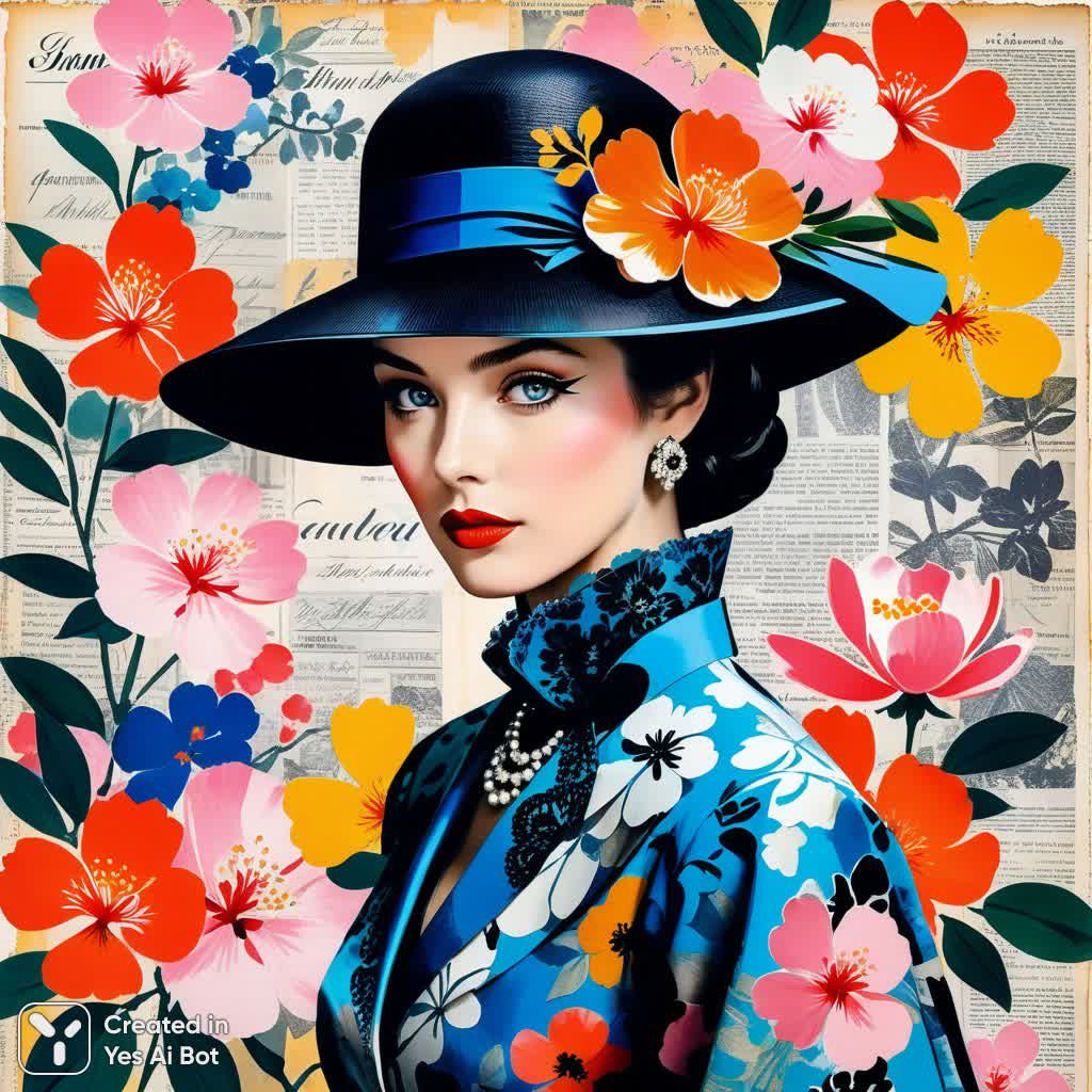 Изысканная смешанная техника коллажа, вдохновленная иллюстрациями из старинных изданий Vogue. Детализированная и красочная винтажная мода гармонично сочетается с фрагментами старых газет, нежными мазками гуаши и элегантными каллиграфическими линиями. Композиция пронизана грацией и орнаментом, напоминая о палитре Марка Шагала, украшенная изящными цветами сакуры и восхитительными узорами. В работе присутствуют элементы теста Rorschach, создающие ощущение загадочности и глубины, а фотореалистичная детализация профессиональной фотографии привносит эффект присутствия. Итоговое изображение поражает своим качеством, представленным в высочайшем разрешении 32k, демонстрируя мастерство исполнения и внимание к мельчайшим деталям. Это произведение искусства воплощает собой симбиоз классической элегантности и современного художественного выражения, создавая неповторимую атмосферу утонченной красоты и эстетического наслаждения. Композиция отличается сложной структурой и многослойностью, где каждый элемент играет свою роль в создании гармоничного целого. Насыщенные цвета и тонкие переходы оттенков придают работе глубину и объемность, а использование различных текстур добавляет визуальный интерес. Коллективное взаимодействие разных техник позволяет создать уникальное произведение, сочетающее в себе элементы живописи, графики и фотографии