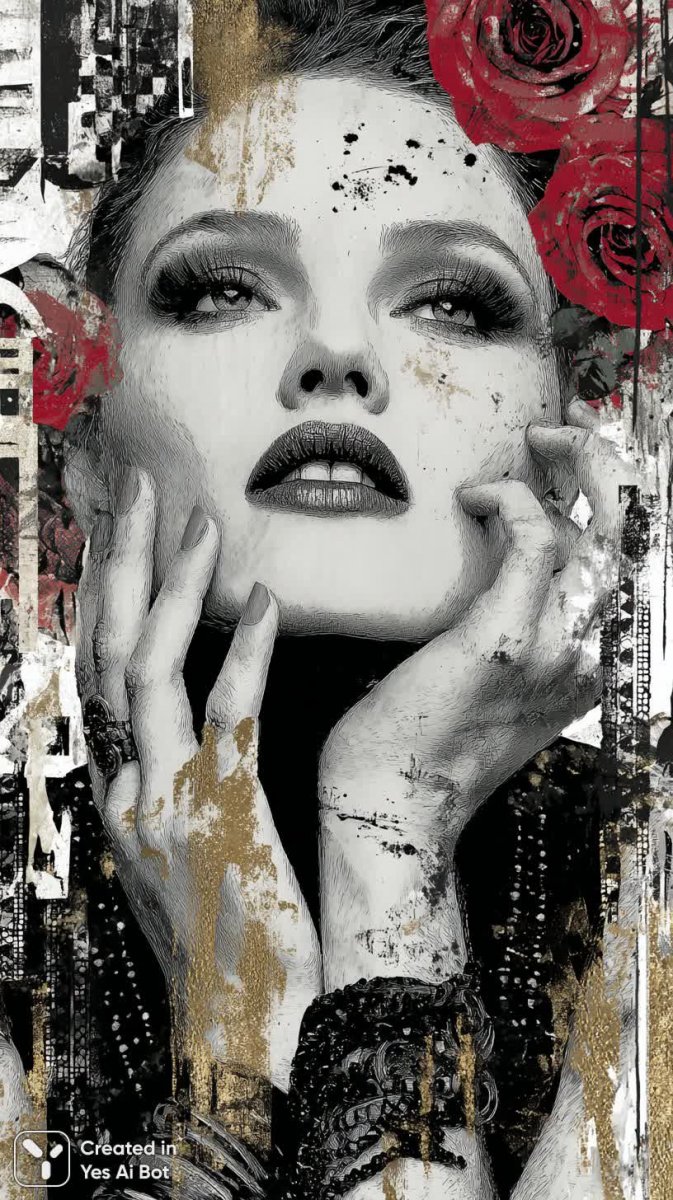 Завораживающий портрет харизматичной женщины, выполненный в гиперреалистичной манере, пленяет своей детализацией и выразительностью. Фон, вдохновленный граффити, представляет собой динамичную композицию из черно-белых полос, контрастно выделяющихся на фоне ярких красок. Акцентным элементом выступают алые розы, добавляющие изображению чувственности и драматизма. Изображение выполнено в технике чернильного рисунка, что придает ему особую графичность и глубину. Особое внимание привлекает мастерски выполненный дизайн макияжа, который представляет собой настоящее произведение искусства. Золотые акценты подчеркивают красоту и изысканность образа, создавая эффект сияния и роскоши. Игра света и тени позволяет передать мельчайшие детали кожи и текстуры волос, делая изображение максимально реалистичным и живым. В целом, это яркий и запоминающийся образ, сочетающий в себе элементы современного искусства и классической портретной живописи. Он вызывает восхищение своей технической сложностью и эстетической привлекательностью, демонстрируя талант художника и его умение создавать уникальные и выразительные произведения. Картина излучает уверенность, силу и женственность, оставляя неизгладимое впечатление на зрителя. Это визуальное воплощение красоты и таланта, способное вдохновить и восхитить любого ценителя искусства