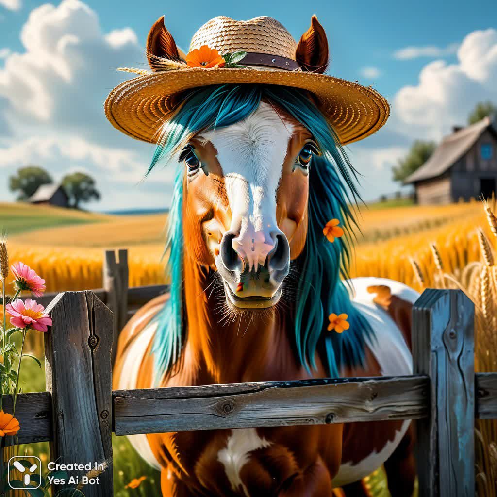 Завораживающая картина в стиле темного фэнтези, выполненная мягкими мазками масла. В центре композиции – антропоморфный пони, застывший у старого деревянного забора на фоне бескрайнего золотого пшеничного поля. Его образ полон очарования и загадочности: увеличенные глянцевые розовые губы, огромные выразительные голубые глаза с длинными ресницами приковывают взгляд. Небрежно растрепанная грива развевается из-под соломенной шляпы, украшенной яркими оранжевыми цветами и сочной зеленью листьев. Художник мастерски передал богатство текстур: заметные мазки кисти оживляют мех пони, грубую фактуру соломы и ткани одежды. Мягкое, уютное освещение создает атмосферу тепла и уюта, а нежные, приглушенные тени добавляют глубины и загадочности. Дизайн персонажа одновременно стилизован и реалистичен, вызывая чувство симпатии и восхищения. Вдали виднеются элементы деревенского дома, создающие ощущение спокойствия и умиротворения, а мягко размытые облака добавляют картине воздушности и объема. Эта работа – настоящее произведение искусства, которое переносит зрителя в волшебный мир, где сказка встречается с реальностью, а красота природы сочетается с очарованием мифических существ. Картина излучает нежность и позитив, оставляя после себя приятное впечатление