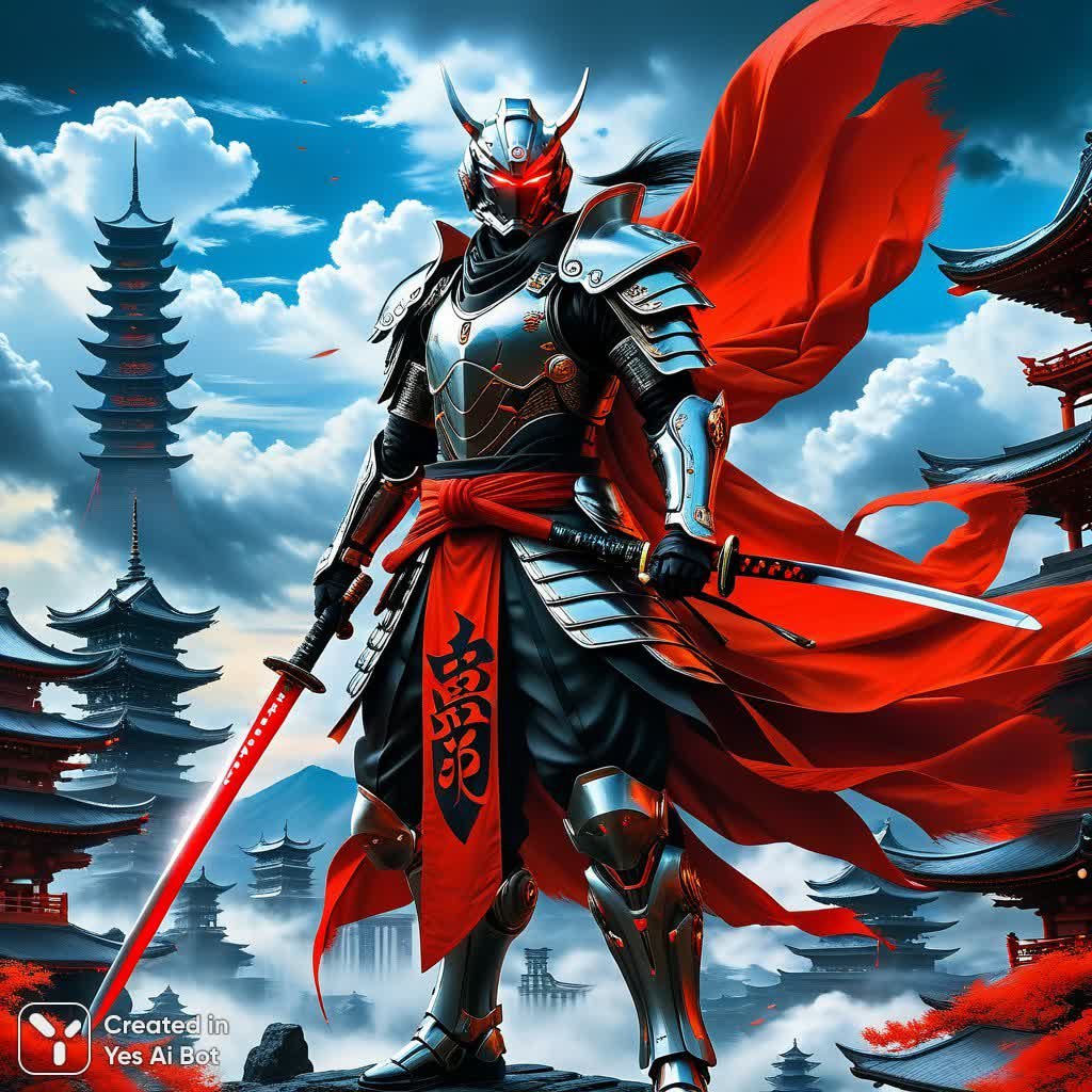 Завораживающее сочетание живописи маслом и фотографии создает гипердетализированный шедевр в духе темного фэнтези и футуристической эстетики. Композиция, выполненная с широкой панорамой, изображает могучего биомеханического самурая, облаченного в развевающийся плащ и вооруженного катаной. Его взгляд пронзителен благодаря светящимся глазам, а на спине развевается ярко-красный стяг, украшенный стилизованными символами, напоминающими древние иероглифы. В мастерском переплетении органических и механических элементов проявляется сложность конструкции: замысловатые пластины кибернетики гармонично сочетаются с видимыми деталями биомеханики, создавая впечатление невероятной силы и технологического совершенства. На фоне раскинулось драматичное небо, динамичные облака которого добавляют сцене глубины и эмоциональности. Широкоугольная перспектива подчеркивает масштабность сцены, а безупречная композиция захватывает взгляд зрителя. Гиперреалистичная проработка деталей, насыщенная цветовая палитра и естественное направленное освещение создают ощущение полного погружения в мир произведения. Эффект поляризационного фильтра, высокое динамическое разрешение и кристально четкая фокусировка на протяжении всего изображения добавляют реалистичности и глубины. Ощутимые текстуры масляной живописи органично сочетаются с фотографической четкостью, создавая уникальный визуальный опыт. Картина выполнена в галерейном качестве, демонстрируя высочайший уровень мастерства и внимания к деталям. Это произведение искусства – настоящий триумф цифрового творчества, воплощающий в себе мощную смесь воображения и передовых технологий