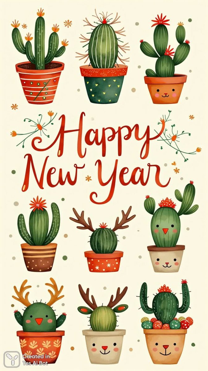 Text: "Happy New Year", folk art collection of nine happy holiday cacti arranged in a cozy grid, first row includes cacti with twinkling lights and decorative pots, second row features succulent plants adorned with cheerful reindeer motifs, third row showcases charming cactus faces surrounded by festive ornaments, BG is warm and inviting with soft hues.