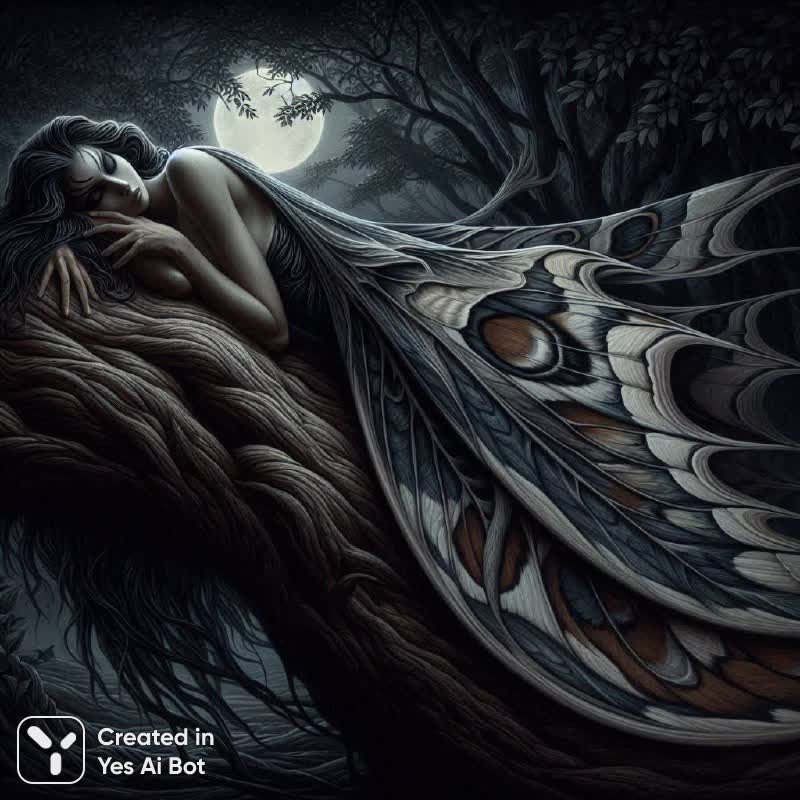 Мрачный портрет женщины-ночной мотылька, запечатлевший атмосферу таинственности и тревоги. Художественное полотно выполнено в темных тонах, создавая ощущение погружения в ночную тьму. Героиня картины – женщина с темными волосами и резкими чертами лица, выражающими глубокую задумчивость и даже некоторую печаль. Она покоится на наклонном стволе дерева, обхватив его руками, словно ища опору в этом непростом мире. Ее спина полуповернута к зрителю, добавляя интриги и загадочности образу. Особое внимание привлекают огромные, сложенные крылья ночной мотылька, выполненные в приглушенных оттенках серого, коричневого и черного, напоминающих о мимолетности жизни и неизбежности перемен. Под крыльями видны тонкие ноги, подчеркивающие хрупкость и уязвимость персонажа. Фон картины представляет собой ночной лес с густой листвой, освещенный лунным светом. Эта детализация создает ощущение замкнутости и изолированности, усиливая общее впечатление от произведения. Вся композиция пронизана духом ужаса и мистики, заставляя зрителя задуматься о скрытых смыслах и тайных страхах. Картина словно рассказывает историю о потерянности, одиночестве и борьбе с внутренними демонами, погружая в атмосферу ночного кошмара и тревожных предчувствий. Она является визуальным воплощением ночных страхов и таинственных сил, скрытых в глубине души человека. Это завораживающий взгляд на хрупкость человеческой природы и ее связь с темными силами окружающего мира