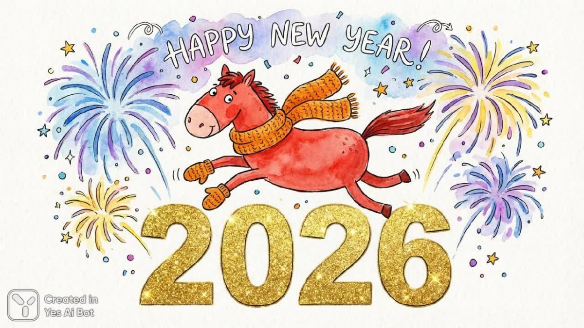 Веселый рисунок в дудл стиле изображает красного коня, укутанного в яркий оранжевый шарф и перчатки. Он игриво прыгает через большие золотые цифры 2026, словно символизируя начало нового года. Вокруг коня буйство праздника: фейерверки расцветают разноцветными огнями, а конфетти искрятся в воздухе, создавая неповторимую атмосферу новогоднего волшебства. Изображение выполнено в акварельной технике с эффектом ручной работы, что придает ему особую теплоту и очарование. Яркие цвета и динамичная поза коня передают радость и предвкушение праздника. Этот забавный рисунок станет прекрасным украшением для новогодних открыток, плакатов или других праздничных материалов. Он излучает позитив и оптимизм, напоминая о чудесах, которые могут случиться в новом году. Стиль дудл придает изображению легкость и непринужденность, а акварельная текстура добавляет ему нежности и воздушности. Это настоящее воплощение новогоднего настроения в ярких красках и веселых деталях. Идеально подойдет для тех, кто ценит оригинальность и хочет привнести немного юмора и праздника в свою жизнь. Забудьте о скучных шаблонах – этот рисунок подарит вам искреннюю улыбку и ощущение приближающегося чуда