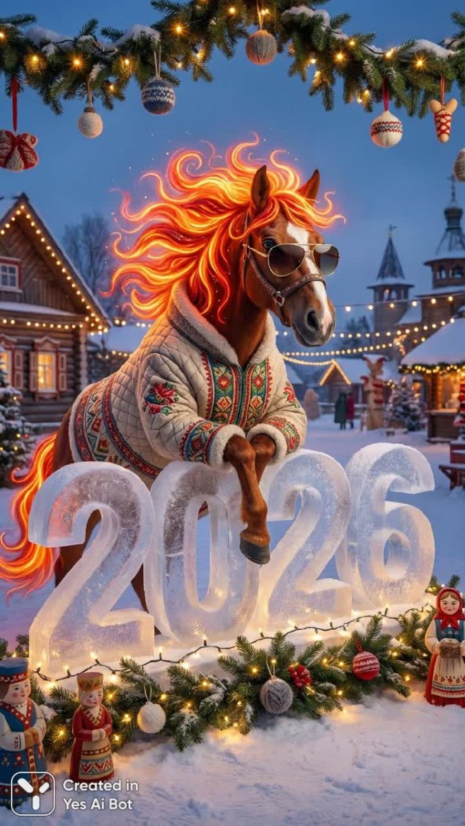 stylish horse with a magical mane of fire, sunglasses, and a winter coat, leaning nonchalantly on the numbers 2026 made of ice, surrounded by sparkling fairy lights and holiday decorations, cartoonish folk art style