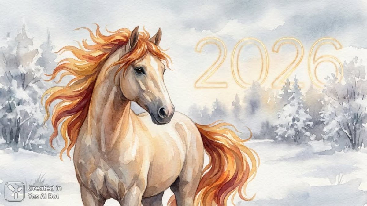 Delicate watercolor illustration, elegant fiery horse with semi-transparent mane, soft snowy landscape, golden 2026 figures in the background, gentle holiday glow, dreamy and calm